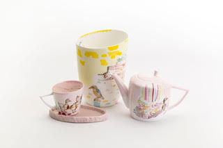 Lowri Davies’ Welsh heritage is a major source of inspiration. Vibrant illustrations of birds, ‘traditional’ landscapes, floral and fauna adorn her own distinct slip-cast bone china tableware that includes tea sets, vessels and vases. These pieces reference established ceramic tableware such as Nantgarw and Swansea porcelain and ceramic souvenirs.